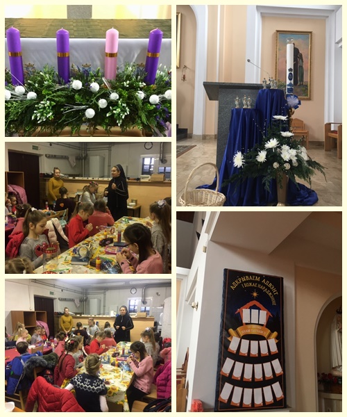 Szczęść Boże! Pozdrawiamy z Białorusi. U nas wszystkie pory roku na raz, dziś po Mszy św. roratniej w Poleckiszkach około 17.00 była nawet bezdeszczowa tęcza. Te okoliczności nie przeszkadzają nam intensywnie oczekiwać na przyjście Małego Jezusa. Zrobiliśmy piękne lampiony, najmłodsi z siostrą na katechezie. Staramy się uczestniczyć w roratach. W tym roku odbywają się one w niezwykły sposób: «na dwie zmiany» — tak jak lekcje w szkole. Jedni chodzą rano inni wieczorem. Zgodnie z tradycją w obydwu przypadkach jest tak ciemno, że zapalone lampiony wyglądają cudownie. Pojawiła się «nowa funkcja», oprócz losowania figurek Matki Bożej (którą chętnie zapraszamy do naszych domów) można jeszcze wylosować mały dzwoneczek. Pomysłem podzieliły się z nami siostry michalitki. Kto go otrzyma powinien dzwonić po drodze do domu i przed kolejnymi roratami w drodze do kościoła — a tym samym przypominać o trwającym adwencie. Nasze oczekiwanie umiliła dziś również wizyta św. Mikołaja. Ponieważ nie ma u nas niegrzecznych dzieci, wszyscy otrzymali coś słodkiego.