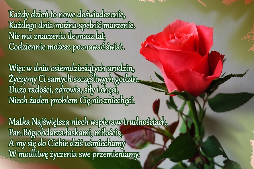 W dniu 80. urodzin naszej kochanej Siostry Teresy Grażul, życzymy jak najwięcej wytrwałości w wierze i pogody ducha czerpanej z miłości do naszego Pana, a także zdrowia i światła tak jasnego, aby żadna siła nie przyćmiła blasku obranej przez Siostrę drogi umiłowania Pana Jezusa. Szczęść Boże, Siostro Tereso! Niech Bóg Jedyny prowadzi Siostrę każdego dnia!