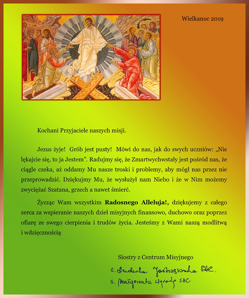 Centrum Misyjne gościło ostatnio trzy uczestniczki zebrania sióstr przełożonych wszystkich naszych prowincji, regii i delegatur z Zarządem Generalnym. S. Basilisa Jacobs z Tanzanii, s. Marie Claire Mukeshimana i s. Belancilla Mukandahiro z Rwandy po raz pierwszy w życiu miały okazję przeżyć w Polsce Triduum Paschalne i Święta Wielkanocne. W Wielki Czwartek uczestniczyły we Mszy św. w Sanktuarium Bożego Miłosierdzia w Ożarowie Maz., a Wigilię Paschalną przeżywały w Katedrze Polowej Wojska Polskiego i trzeba przyznać, że były pod wielkim wrażeniem celebrowania w Polsce Wielkiej Soboty oraz procesji rezurekcyjnej. W sobotę odwiedziły wiele warszawskich kościołów, aby przyjrzeć się grobom Pana Jezusa. Ta tradycja nie jest znana w Afryce, stąd ich zaciekawienie i podziw dla twórców symbolicznych grobów Pańskich. Dużym przeżyciem dla sióstr był pobyt w Niepokalanowie, udział we Mszy św., modlitwa w kaplicy wieczystej adoracji i odwiedziny w Muzeum św. Maksymiliana Kolbe. Postać tego świętego jest dobrze znana w Arusha w Tanzanii, gdyż pracują tam OO. Franciszkanie. Siostry odwiedziły także Wilanów i mogły podziwiać Świątynię Opatrzności Bożej oraz pałac i park w pięknej, wiosennej szacie. Cieszyły się z możliwości poznania sióstr z obu wspólnot w Ursusie i spędzenia czasu w Centrum Misyjnym. Oprócz pięknych wspomnień i zdjęć zabrały ze sobą także upominki z Polski dla sióstr w Rwandzie i Tanzanii, a szczególnie dla nowicjuszek z terenu Afryki, które w Arusha odbywają wspólnie formację. Dla wspólnoty pobyt sióstr z Afryki był także ubogacający i mobilizował siostry do wysiłku porozumiewania się w języku angielskim lub francuskim. Dziś po śniadaniu pożegnałyśmy już siostry, które po południu rozpoczną udział w zebraniu odbywającym się najpierw w Ołtarzewie, a następnie w Gdańsku.