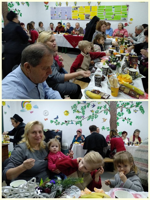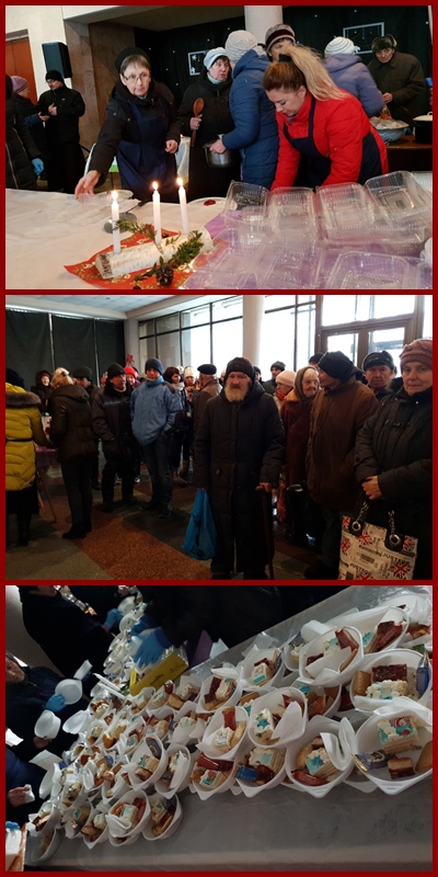 W teatrze „Żowteń” w Żytomierzu, 8 stycznia o godz. 14.00 rozpoczął się obiad dla bezdomnych i biednych. Parafianie zebrali środki, ZAK wziął na siebie przygotowanie bigosu, ziemniaków z pieca oraz duszonego mięsa, s. Karolina Słomińska zrobiła dekorację i koordynowała pracę, by wszystko grało jak w szwajcarskim zegarku. Dwie godziny przygotowań przed samym obiadem i ... pierwsze liczenie przybywających gości. Szok! Przygotowaliśmy na 150, a przyszło 250 osób. Mieliśmy 200 łyżek, więc 50 trzeba było dokupić. Wystarczy dla wszystkich, czy nie? Napięcie rosło i natychmiast popłynęła serdeczna modlitwa wszystkich pomagających. Boże pomóż!!! Tego dnia przypadała Ewangelia o rozmnożeniu chleba. 30 porcji można jakoś dołożyć, ale nie 100. Po ludzku to niemożliwe. A jednak stało się! Wszyscy zostali nakarmieni! Niech będzie uwielbiony Bóg w Trójcy Świętej. Amen.