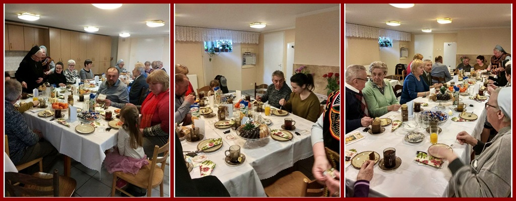 Przed świętem Bożego miłosierdzia, w sobotę 7 kwietnia, odbyło się w Centrum Misyjnym wielkanocne spotkanie z osobami, które wspierają nasze misje, a mieszkają na terenie Warszawy. Ich grono powiększa się ze spotkania na spotkanie o Polaków z Ukrainy zamieszkałych na stałe w Polsce i przez znajomość z siostrami, które pracowały na Wschodzie, związanych z naszym Zgromadzeniem.
