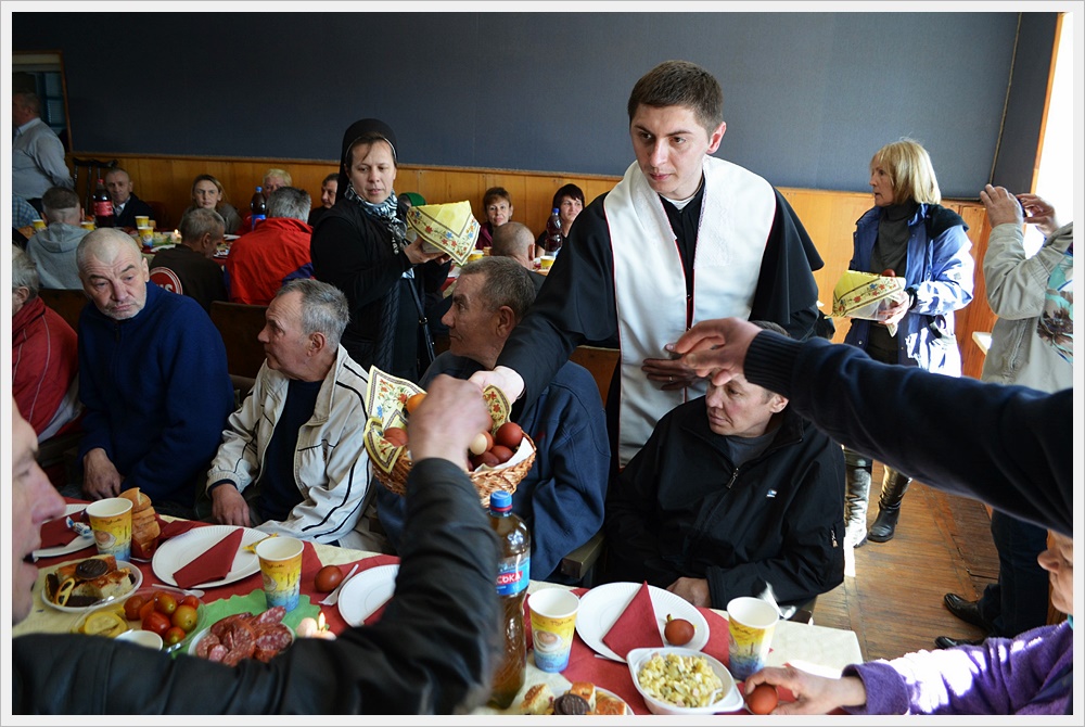Staraniem ZAK przygotowano świąteczny obiad dla 50 osób. Spotkanie przebiegało w bardzo rodzinnej atmosferze, mimo że wszyscy pensjonariusze noclegowni z racji rozmaitych trudnych życiowych historii żyją z dala od swych rodzin. Na początku ksiądz pallotyn poświęcił świąteczne potrawy. Po złożeniu życzeń każdy otrzymał tradycyjne jajko, aby podzielić się nim z innymi. Podczas obiadu młodzież z parafii Bożego Miłosierdzia śpiewała wielkanocne pieśni. Po spożyciu posiłku wszyscy wysłuchali katechezy paschalnej. Zwrócono w niej szczególną uwagę na obecność Zmartwychwstałego Jezusa w naszej codzienności. To On daje nam moc do przemiany życia. Po katechezie śpiewaliśmy wszyscy razem z chórem pieśni wielkanocne. Na koniec świątecznego spotkania każdy mieszkaniec noclegowni otrzymał słodki podarunek, na który składały się własnoręcznie przygotowane domowe wypieki.