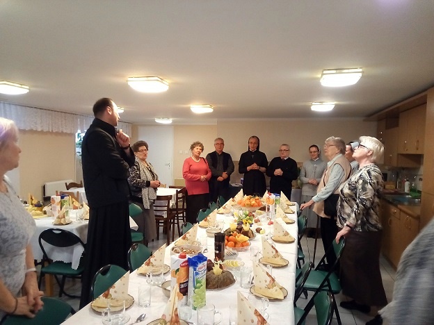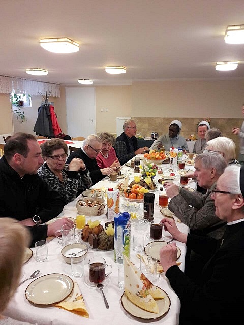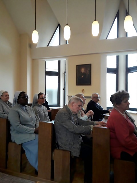 Po niej wszyscy spotkali się na podwieczorku. S. Marta opowiedziała zebranym o pobożności Rwandyjczyków, szczególnie o Sanktuarium Maryjnym w Kibeho oraz Sanktuariach Miłosierdzia Bożego w Ruhango i Kabuga. S. Clotilde podzieliła się natomiast wrażeniami z Polski, w której jest po raz pierwszy. Mówiła, m.in., że jej zdaniem klimat naszych mszy św. bardziej sprzyja modlitwie niż liturgia afrykańska pełna śpiewu i tańca. Swoją historię opowiedziała także zebranym p. Anastazja licząca 92 lata, która zupełnie nie wygląda na swój wiek, ma doskonałą pamięć i świetnie radzi sobie na co dzień w pojedynkę. Nasi dobrodzieje zostali obdarowani krzyżykami z Rwandy i różańcami. Oni z kolei wsparli nas ofiarami na potrzeby misji.