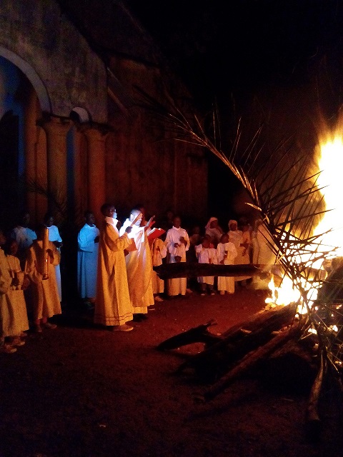Wcześniej bowiem myślałam sobie tak: ,, Panie Jezu, i cóż mi po tych świętach, nic nie rozumiem z tego co się mówi w trakcie liturgii, bo albo jest w języku ewondo (język miejscowy), albo po łacinie, której też nie znam, albo po francusku, który rozumiem niewiele lepiej niż łacinę". Gdy jednak ksiądz zaczął wyśpiewywać wraz z chórem orędzie paschalne, wzruszyłam się do łez, mimo że nie rozumiałam ani jednego słowa. Exultet w języku ewondo był tak samo spektakularny co w j. polskim, a subtelnie tańczące dziewczęta, podkreślały uroczysty charakter chwili.