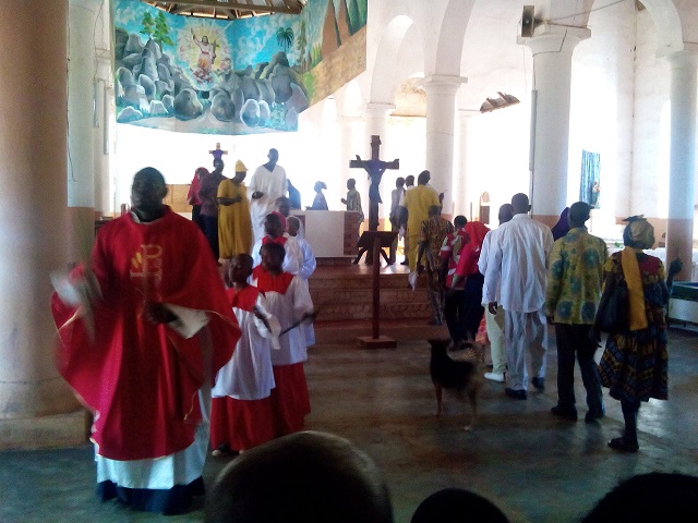 Po słowach ,,I skłoniwszy głowę oddał ducha" uklękliśmy, a następnie ksiądz, a za nim służba liturgiczna i każdy kto chciał z ludzi, ruszyli w tańczącej procesji, przy akompaniamencie bębnów, by ogłosić wszystkim śmierć Pana Jezusa.